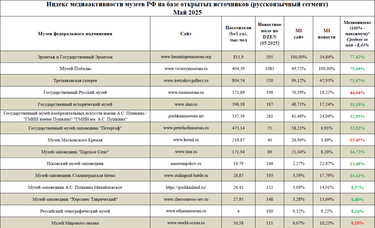 Уважаемые коллеги, исследовательская команда "Социального навигатора" МИА "Россия сегодня" представляет вам результаты независимого мониторинга результативности реализации медиастратегий музеев на российском информационном поле.